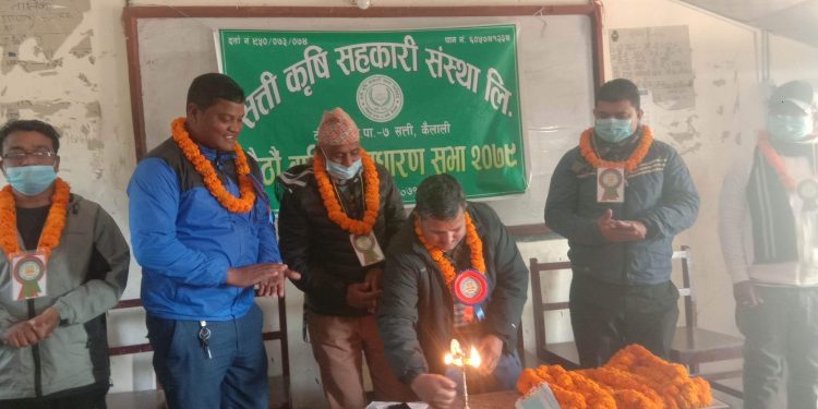 टीकापुर / कैलालीको टीकापुर नगरपालिका वडा न ७ स्थित सत्ती कृषि सहकारी संस्था लिमिटेड काे छैठाे बार्षिक साधारण सभा सम्पन्न भएकाे छ । सहकारी संस्थाका अध्यक्ष खड्क प्रसाद भणडारीकाे अध्यक्षतामा भएकाे साधारण सभामा टीकापुर नगरपालिका वडा न ७ का वडाअध्यक्ष यज्ञ प्रसाद न्याैपाने प्रमुख अतिथि रहेका थिए भने टीकापुर नगरपालिका वडा न ६ का वडाअध्यक्ष बलिराम चाैधरी बिशिष्ठ अतिथि रहनु भएकाे थियाे । सहकारी संस्थाका उपाध्यक्ष धर्म ढुङ्गानाकाे स्वागत मनतव्यसंगै शुरु भएकाे सभामा संस्थाका अध्यक्ष ले प्रगति प्रतिबेदन प्रस्तुत गरेका थिए । सहकारी ले ३ लाख २२ हजार खुद मुनाफा गर्न सफल भएकाे छ भने अार्थिक वर्ष २०७९/८०काे २८ लाख ३९ हजार ५ सय २५ बराबरकाे अाय व्य सार्वजनिक गरेकाे छ । मल बिउकाे समेत खरिद बिक्रीवितरण गर्ने गरेकाे साे सहकारीले कृषकलाई सहज भएकाे अझै ऋण मा समेत लगानि लगाई सहज बनाउनमा जाेड दिनु पर्ने कार्यक्रम का प्रमुख अतिथि यज्ञ प्रसाद न्याैपानेले बताए ।कार्यक्रममा युवाल संजाल का अध्यक्ष सन्ताेष नेपाली , नव युवा क्लबका अध्यक्ष धर्म घर्तिमगर, उज्यालो बहुउद्देश्यीय सहकारी संस्थाका उपाध्यक्ष शशी श्रेष्ठ ,धनसिहपुर कृषि सहकारी संस्थाका अध्यक्ष धनसिह साउद , भानु सामुदायिक तथा श्राेत केन्द्र का अध्यक्ष मनिराम ढुङ्गाना लगायतले शुभकामना मनतव्य राखेका थिए भने संचालन सुमन तिमल्सेनाले गरेका थिए ।