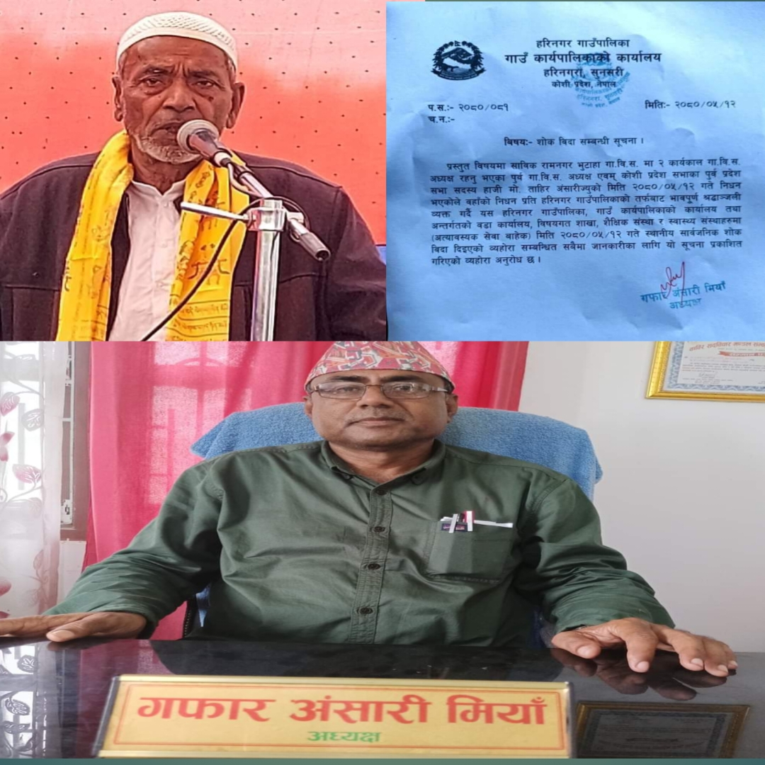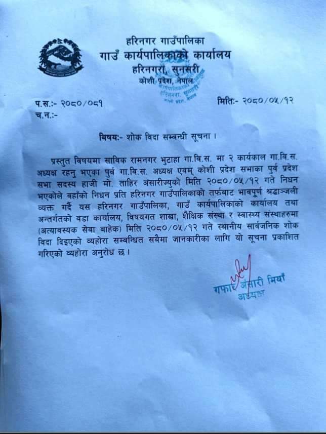गाउँपालिकाले अध्यक्ष गफार अंसारीले निकालिएको सूचना अनुसार साविक रामनगर भुटाहा गा.वि.स. मा २ कार्यकाल गा.वि.स. अध्यक्ष रहनु भएका पुर्व गा.वि.स. अध्यक्ष एवम् कोशी प्रदेश सभाका पूर्व प्रदेश सभा सदस्य हाजी मो. ताहिर अंसारीको निधन भएकोले वहाँको निधन प्रति हरिनगर गाउँपालिकाको तर्फबाट भावपूर्ण श्रद्धाञ्जली व्यक्त गर्दै शाेक बिदा दिइएको बताइएको छ ।