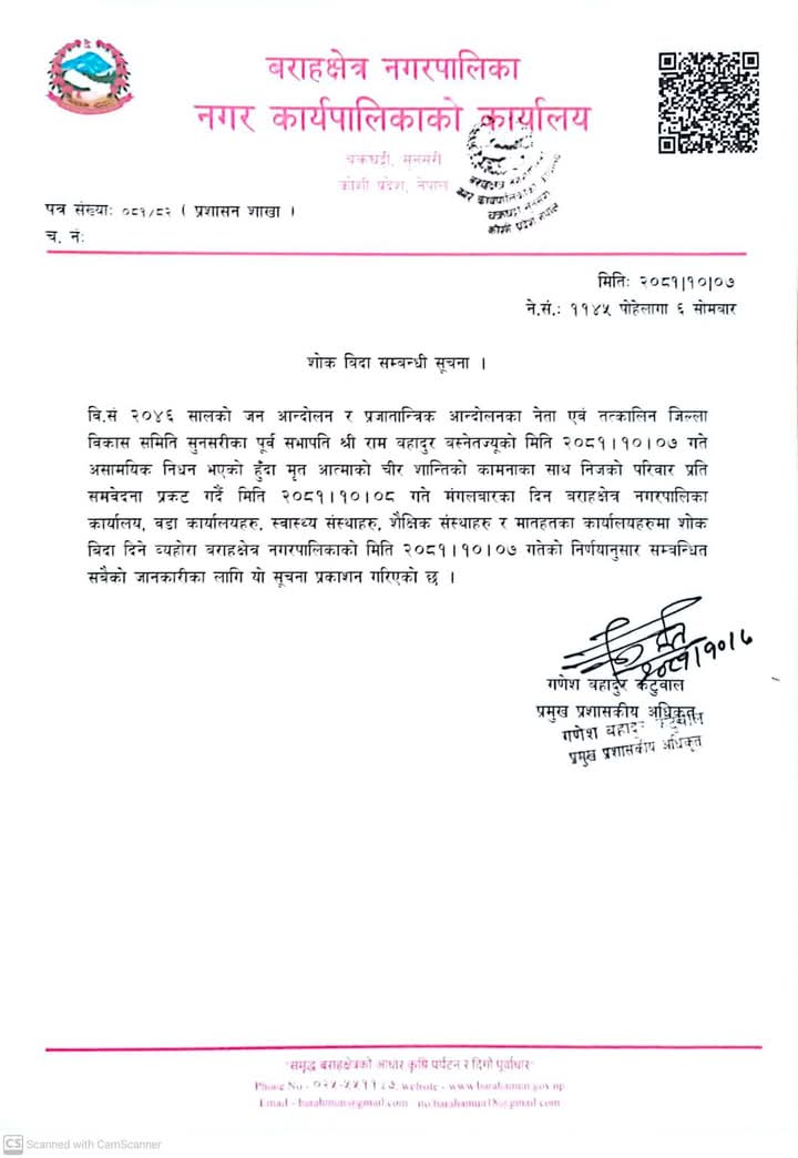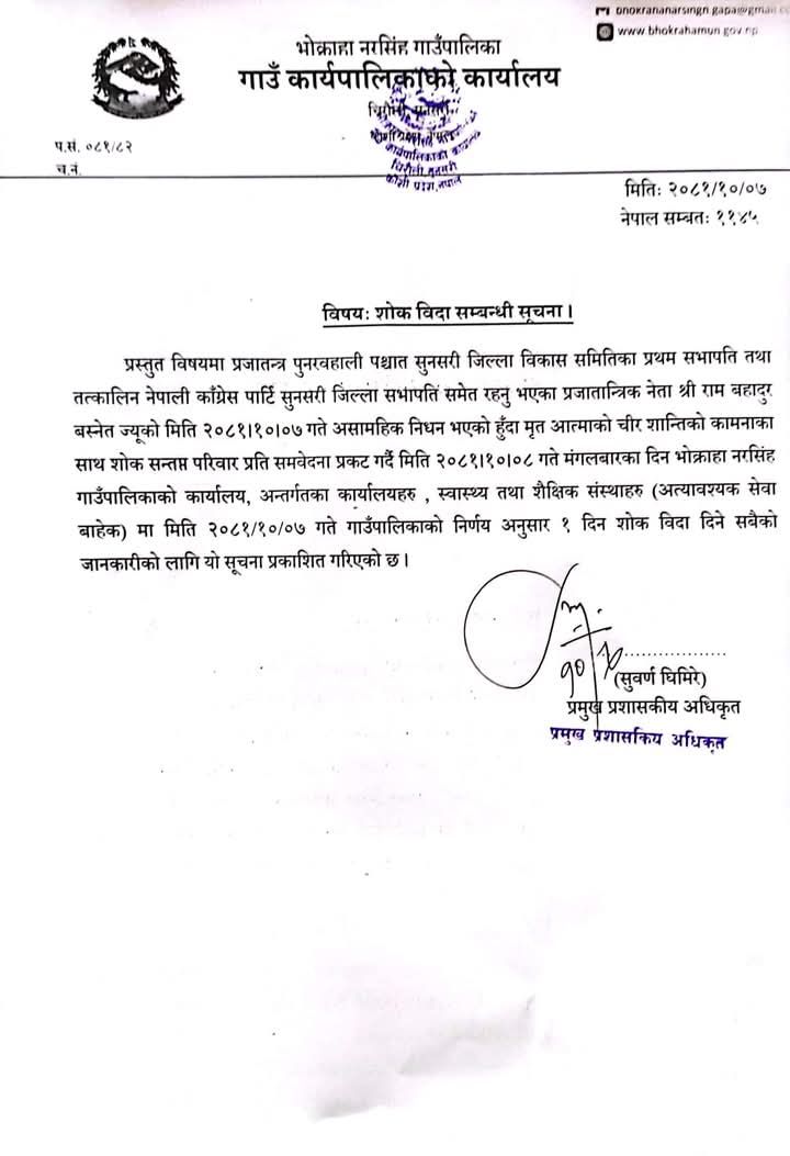 इनरूवा नगरपालिका, दुहबी नगरपालिका र भोक्राहा नरसिंह गाउँपालिकाका प्रमुख प्रशासकीय अधिकृतहरूले भाेली ०८ गते सार्वजनिक विदा दिने निर्णय गर्दै शोक व्यक्त गरेका छन्। यस निर्णयले स्थानीय प्रशासनिक इकाइहरूलाई दिवंगत नेता श्री राम बहादुर बस्नेतको योगदानलाई सम्मान गर्ने अवसर प्रदान गरेको छ।