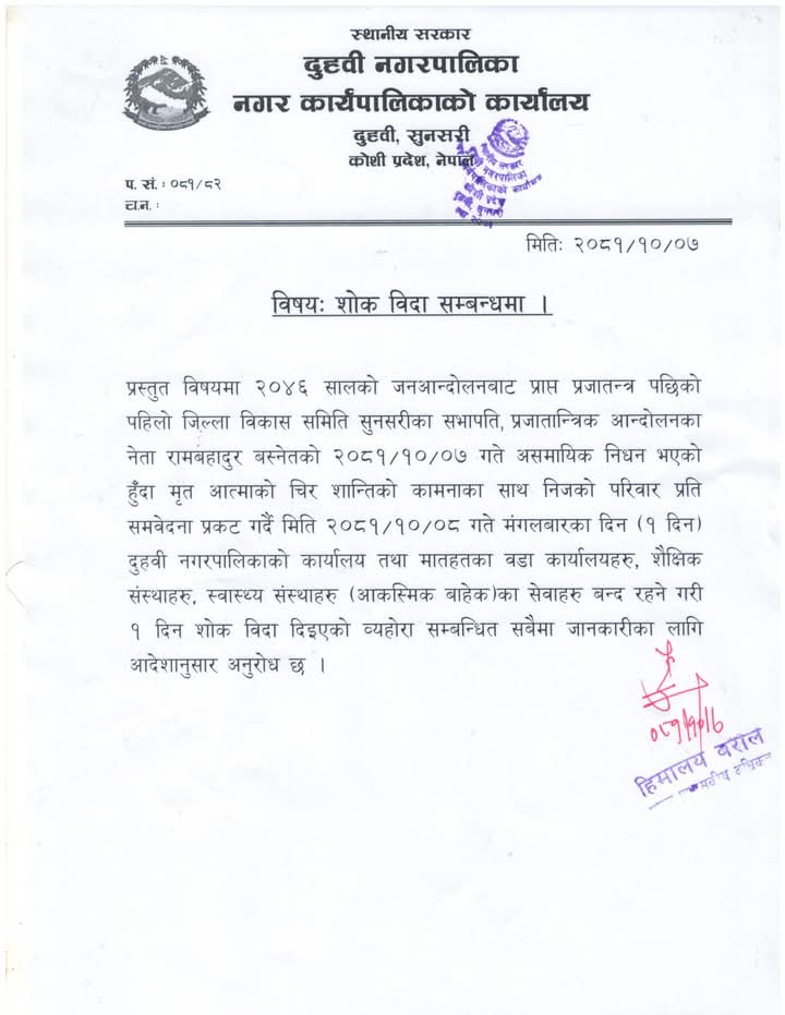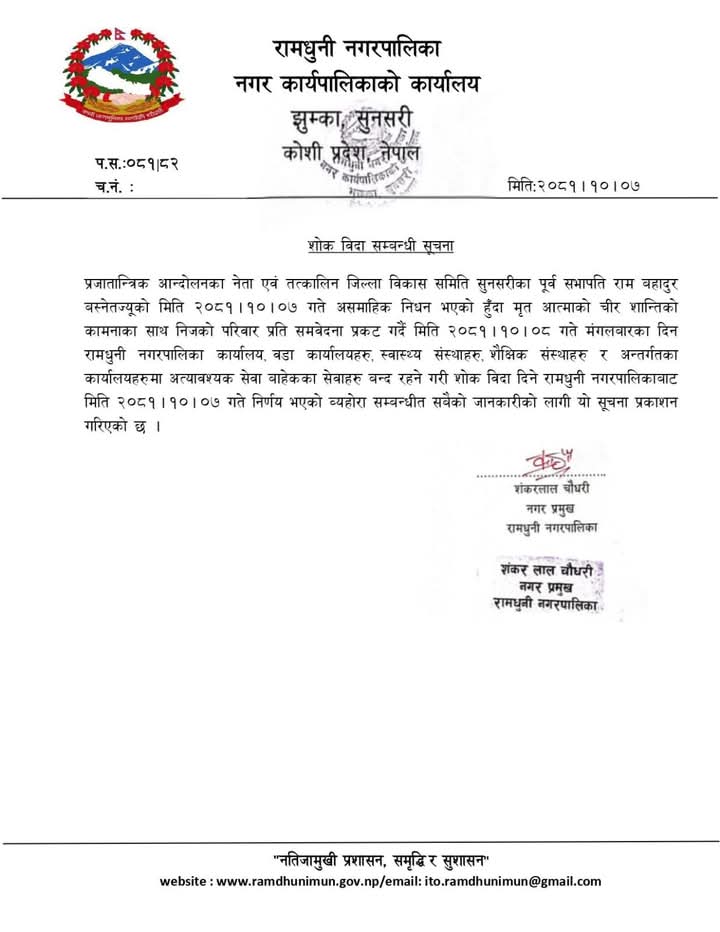 दिवंगत नेता बस्नेतको योगदानलाई सम्मान गर्दै, सुनसरी जिल्लाका १२ वटा स्थानीय तहमध्ये ९ वटाले आज १ दिनको शोक विदा घोषणा गरेका छन्।