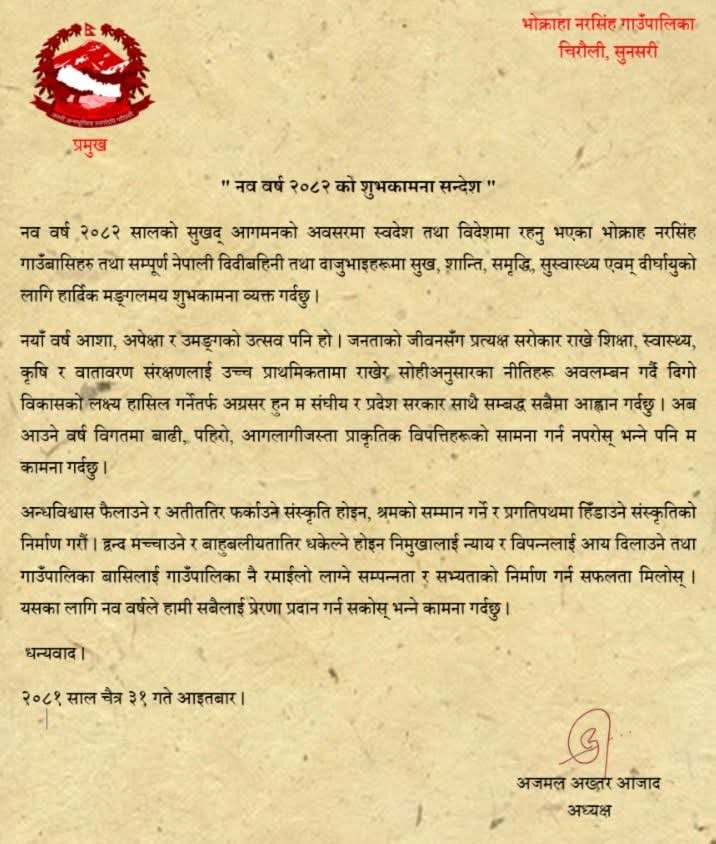 इनरूवा – सुनसरीको भोक्राह नरसिंह गाउँपालिकाका अध्यक्ष अजमल अख्तर आजादले नव वर्ष २०८२ सालको पावन अवसरमा स्वदेश तथा विदेशमा रहनु भएका सम्पूर्ण नेपाली दाजुभाइ तथा दिदीबहिनीहरूलाई सुख, शान्ति, समृद्धि, सुस्वास्थ्य एवम् दीर्घायुको शुभकामना व्यक्त गरेका छन्।