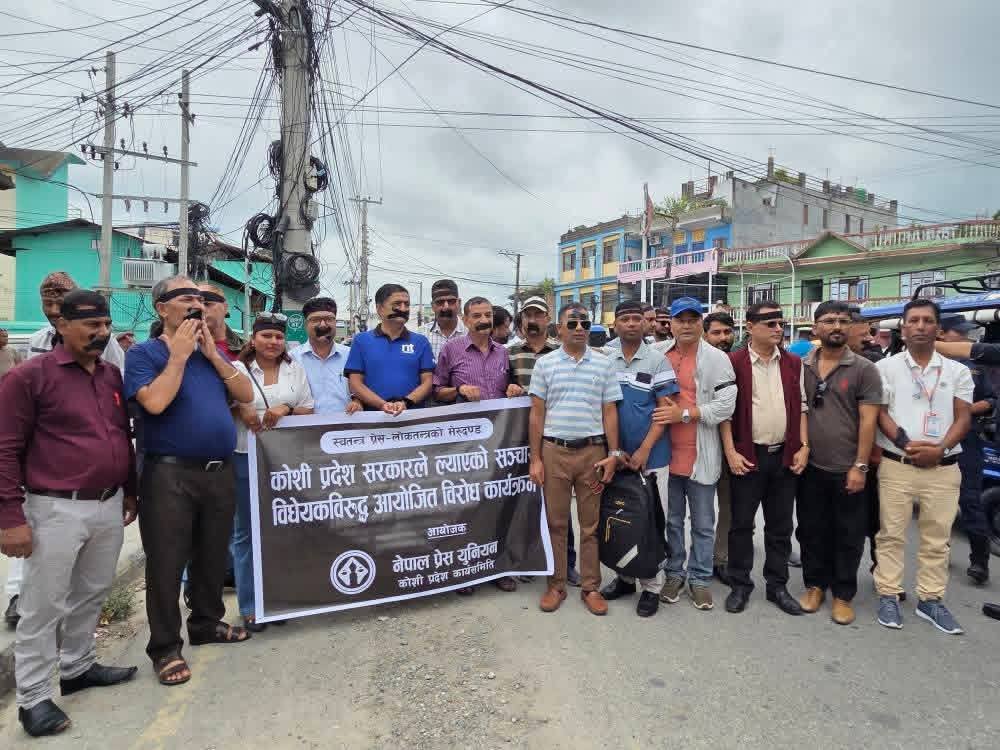सरकारले विधेयक मार्फत सञ्चार स्वतन्त्रता सीमित गर्ने प्रयास गरिरहेको आरोप लगाउँदै विराटनगरमा भेला भएका पत्रकारहरूले मुख र हातमा कालोपटी बाधेर विरोधमा उत्रिएका छन् । विरोध कार्यक्रममा प्रेस युनियनका केन्द्रिय पदाधिकारी लगायत अन्य प्रेस संघ संघठनहरुका पत्रकारहरुको सहभागिता रहेको थियो ।