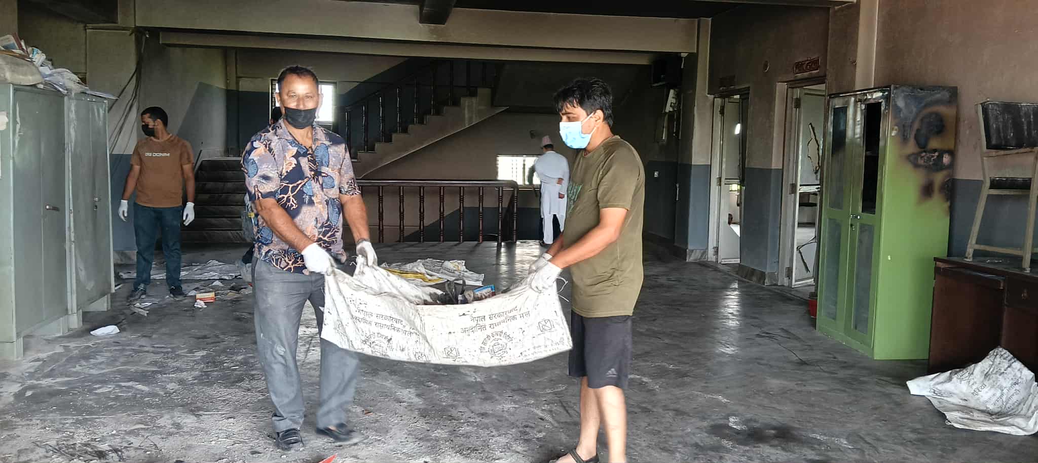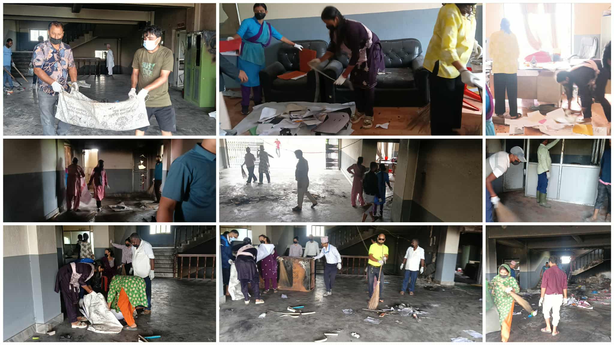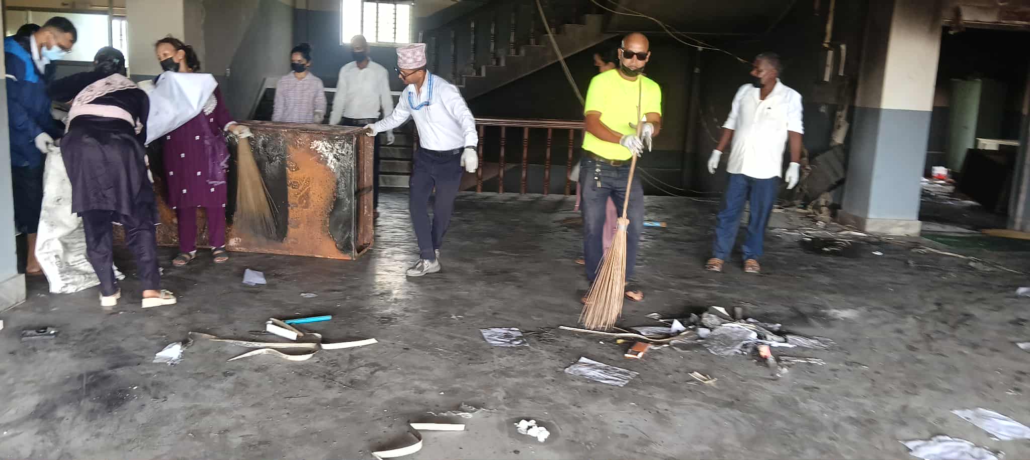 भित्ताभरि कालो धुवाँका दाग, जलेका अभिलेख र धुलाम्य कोठाबीच कर्मचारीहरूले घर वा मन्दिर सफा गरेझैँ घरबाटै झाडू, मास्क र पञ्जा लिएर सफाइमा जुटे। कसैले झाडू समाते, कसैले खरानी भएका कागज बोरामा भरे, कसैले जलेका फर्निचर बाहिर निकाले। बिहान १० बजेदेखि बेलुकी ४ बजेसम्म निरन्तर चलेको अभियानपछि कार्यालयलाई पुनः प्रयोगयोग्य बनाउन प्रारम्भिक काम पूरा गरिएको छ।