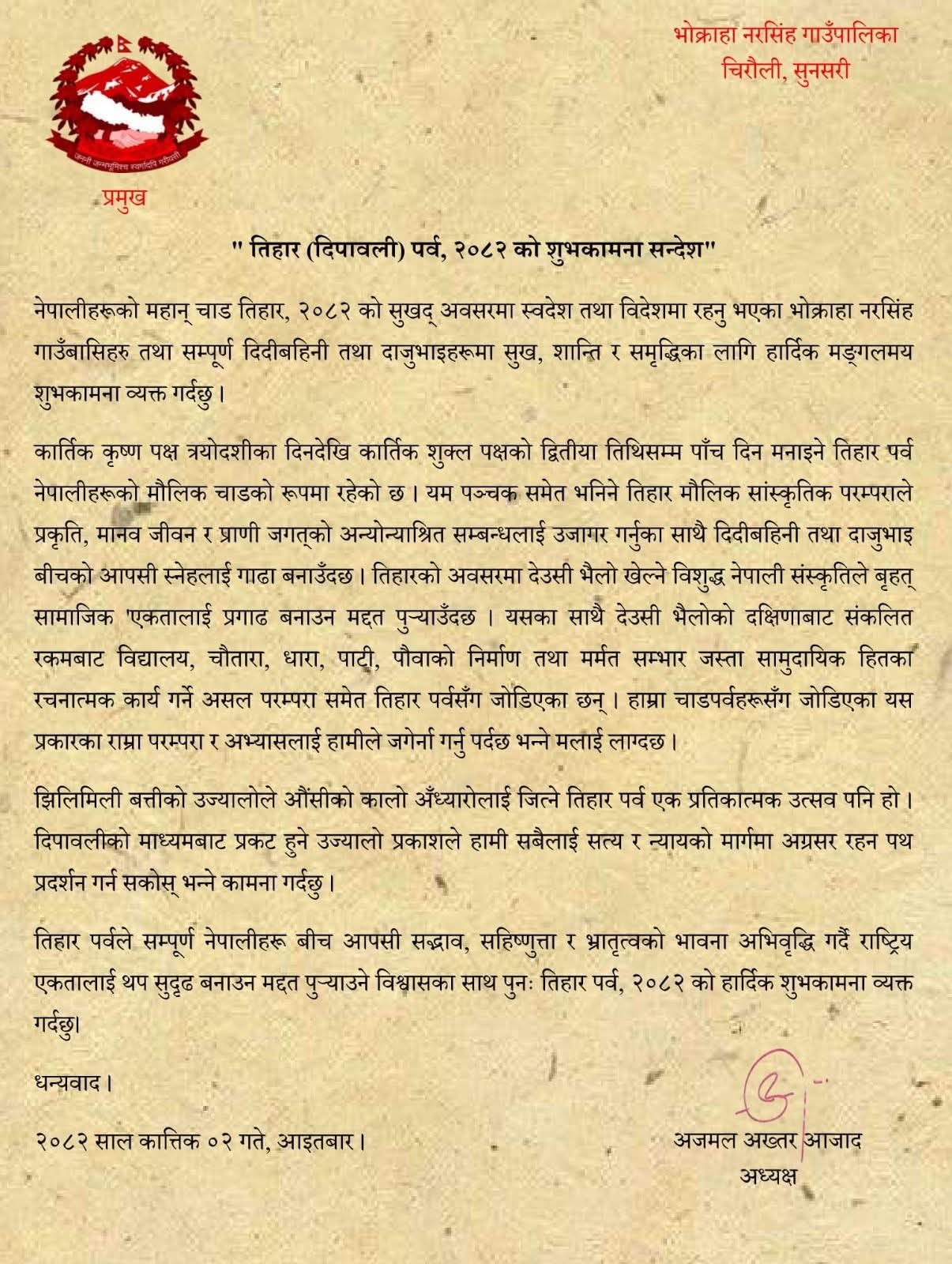 सुनसरी । भोक्राहा नरसिंह गाउँपालिकाले तिहार (दीपावली) पर्व–२०८२ का अवसरमा शुभकामना सन्देश जारी गरेको छ। गाउँपालिकाका अध्यक्ष अजमल अख्तर आजादले स्वदेश तथा विदेशमा रहेका सम्पूर्ण गाउँबासीहरूलाई हार्दिक शुभकामना दिँदै सबैमा आपसी एकता, मेलमिलाप र सद्भाव सुदृढ बनाउन आह्वान गरेका छन्।