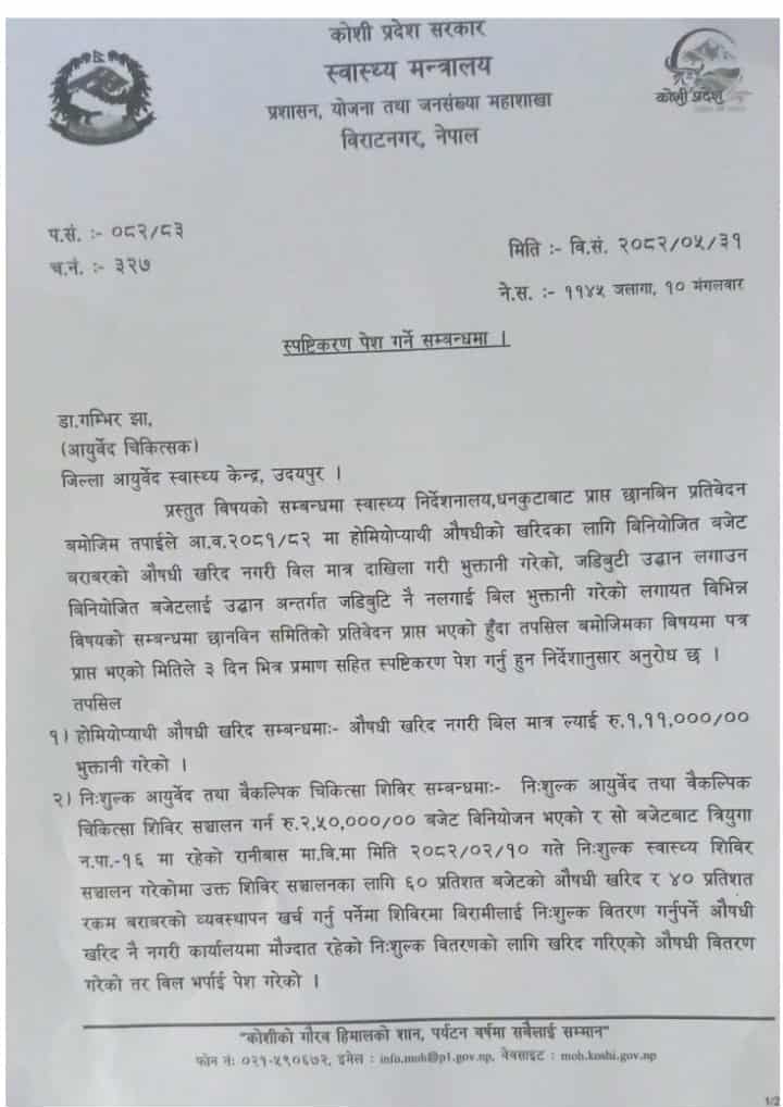उता भदौ १८ गते बुझाइएको प्रतिवेदनका आधारमा मन्त्रालयले सोधेको छ । “औषधी खरिद नगरी बिल किन पेस ?” , “जडिबुटी नरोपेर भुक्तानी किन ?” मन्त्रालयका सचिव डा. यदुचन्द्र घिमिरेले भने “चित्तबुझ्दो जवाफ नआए कानुनअनुसार कडा कारबाही हुन्छ।”