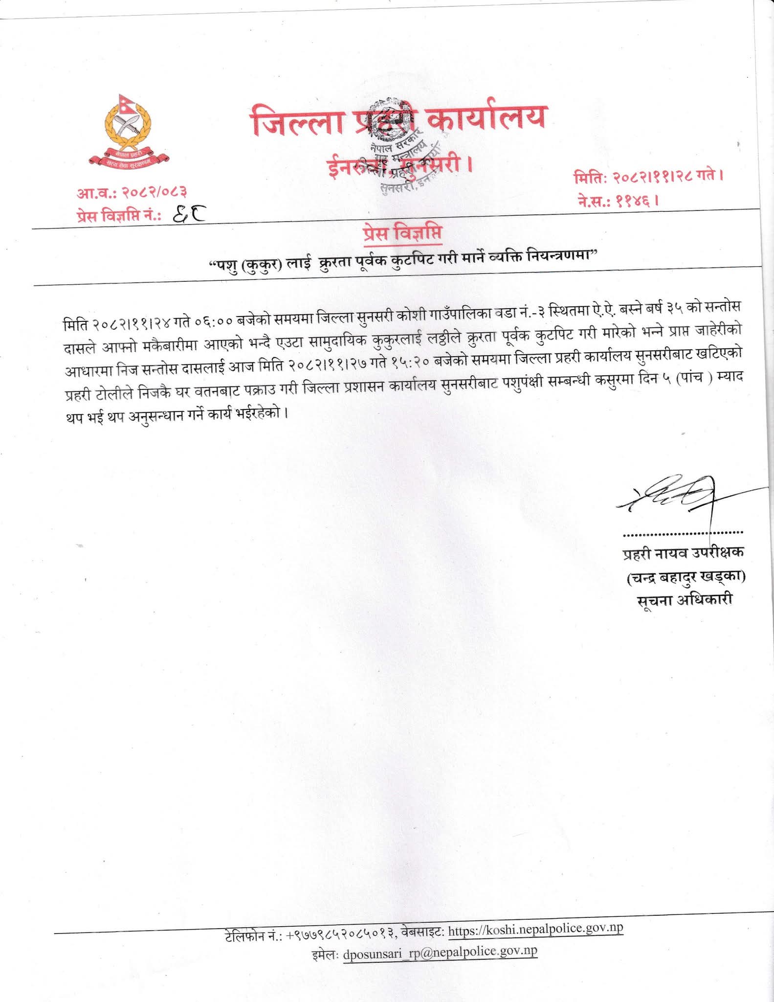 पक्राउ पर्नेमा सोही स्थानका ३५ वर्षीय सन्तोष दास रहेका छन्। आफ्नो मकैबारीमा आएको भन्दै उनले एउटा सामुदायिक कुकुरलाई लठ्ठीले कुटपिट गरी मारेको भन्ने जाहेरीका आधारमा उनलाई पक्राउ गरिएको जिल्ला प्रहरी कार्यालय सुनसरीले जनाएको छ।