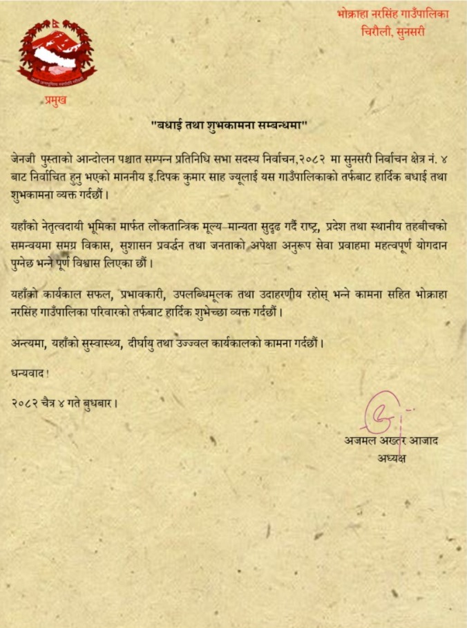 सुनसरी । प्रतिनिधि सभा सदस्य निर्वाचन, २०८२ पश्चात सुनसरी निर्वाचन क्षेत्र नं. ४ बाट निर्वाचित माननीय इन्जिनियर दिपक कुमार साहलाई भोक्राहा नरसिंह गाउँपालिकाले औपचारिक रूपमा बधाई तथा शुभकामना व्यक्त गरेको छ। गाउँपालिका अध्यक्ष अजमल अख्तर आजादले एक सन्देश जारी गर्दै नव निर्वाचित सांसद साहको सफल कार्यकालको कामना गरेका हुन्।