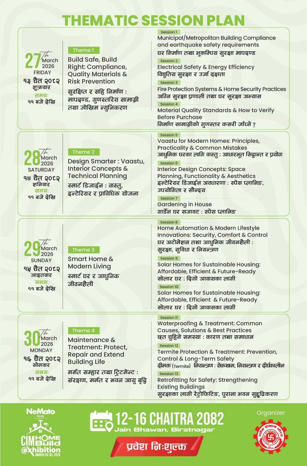 इनरुवा । मोरङ उद्योग संगठनले कोशी प्रदेशमा पहिलोपटक ‘होम बिल्ड एक्सिभिसन’ आयोजना गर्दैछ। चैत १२–१६ गते विराटनगरको जैन भवनमा हुने यस प्रदर्शनीमा घर निर्माण, भूकम्पीय सुरक्षा, उर्जा दक्षता, इन्टेरियर डिजाईन, गार्डेन सजावट, घर अटोमेशन र पुराना भवन सुदृढीकरणसम्बन्धी ज्ञान सँगाल्न सकिनेछ। विभिन्न विशेषज्ञहरूले सहभागीहरूलाई व्यावहारिक सुझाव र मार्गदर्शन प्रदान गर्नेछन्।