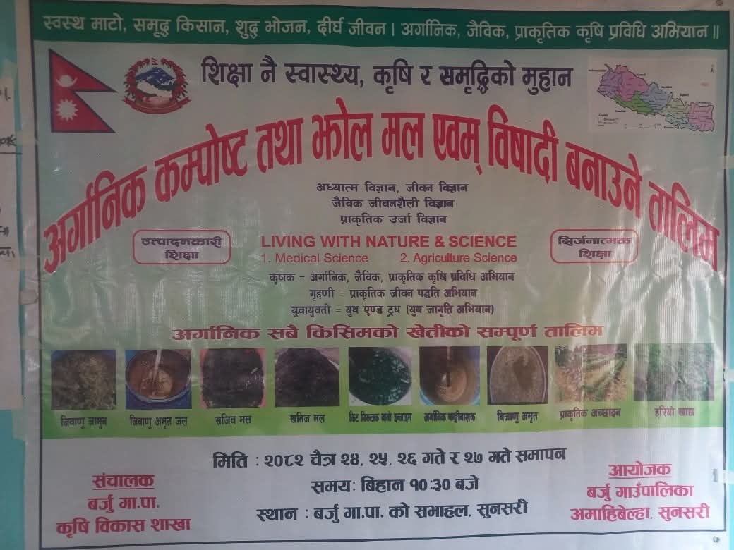 सुनसरी । अर्गानिक कृषि प्रणालीलाई प्रवर्द्धन गर्दै किसानलाई जैविक खेतीतर्फ आकर्षित गर्ने उद्देश्यले सुनसरीको बर्जु गाउँपालिकामा ‘अर्गानिक कम्पोष्ट, झोल मल एवम् जैविक विषादी उत्पादन सम्बन्धी ४ दिने तालिम’ सञ्चालन गरिएको छ।