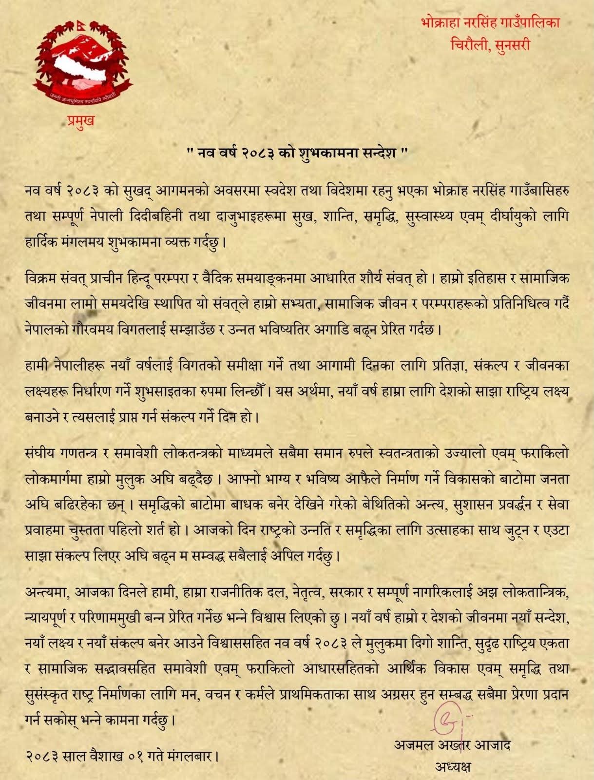 चिरौली । सुनसरीकाे भोक्राहा नरसिंह गाउँपालिकाका अध्यक्ष अजमल अख्तर आजादले नयाँ वर्ष २०८३ को अवसरमा स्वदेश तथा विदेशमा रहेका सम्पूर्ण नेपाली दिदीबहिनी तथा दाजुभाइलाई सुख, शान्ति, समृद्धि र दीर्घायुको कामना गर्दै शुभकामना सन्देश जारी गरेका छन् ।